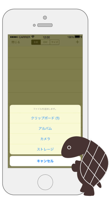 どこからファイルをインポートするか選択します (「クリップボード」, 「アルバム」, 「ストレージ」, 「iTunes フォルダ」よりファイルの追加が可能です).
