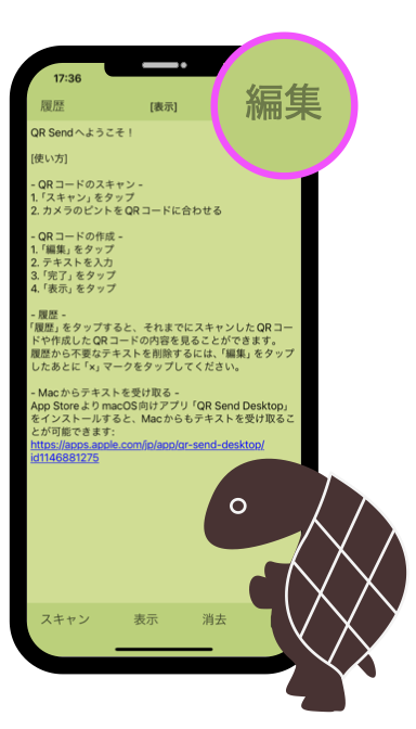 「QR Send」は, 「QR Send」と「QR Send」, 「QR Send」と「QR Send Desktop」, あるいは「QR Send」と「QR Scan」との間でテキストをシェアすることを前提に設計されています.