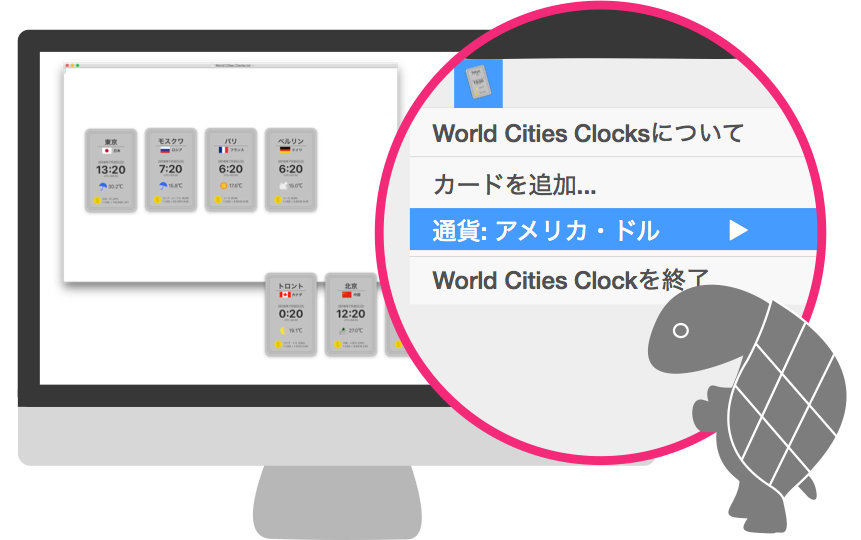 「World Cities Clocks」はあなたが選択した都市の時刻, 天気, 為替レートをカードのようなウインドウに表示します.