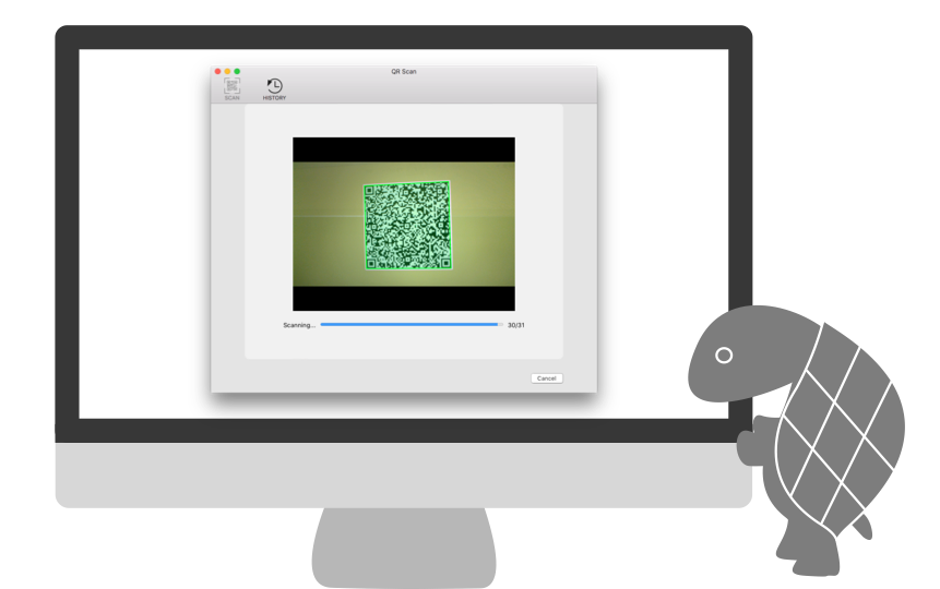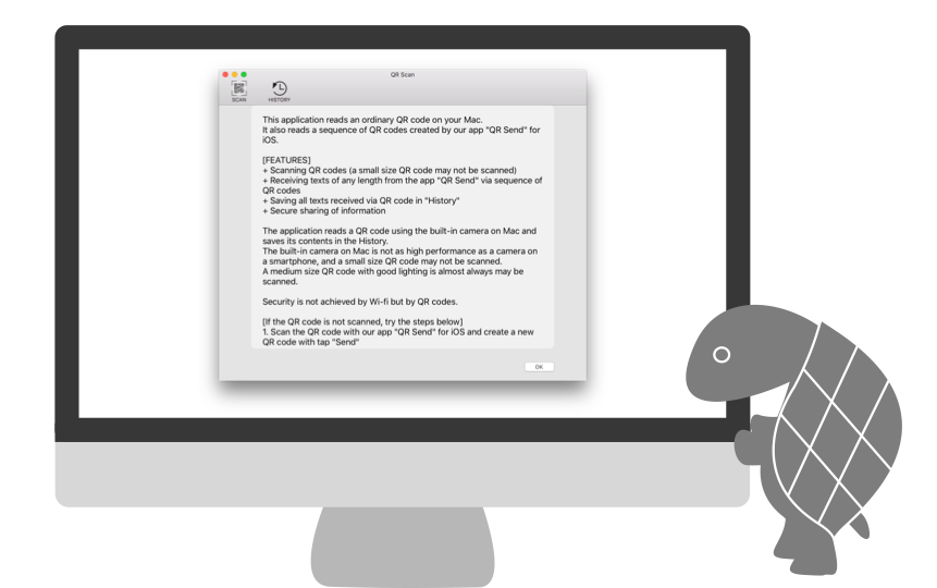 "QR Scan" reads an ordinary QR code on Mac. It also reads a sequence of QR codes created by our app "QR Send" for iOS/iPadOS.