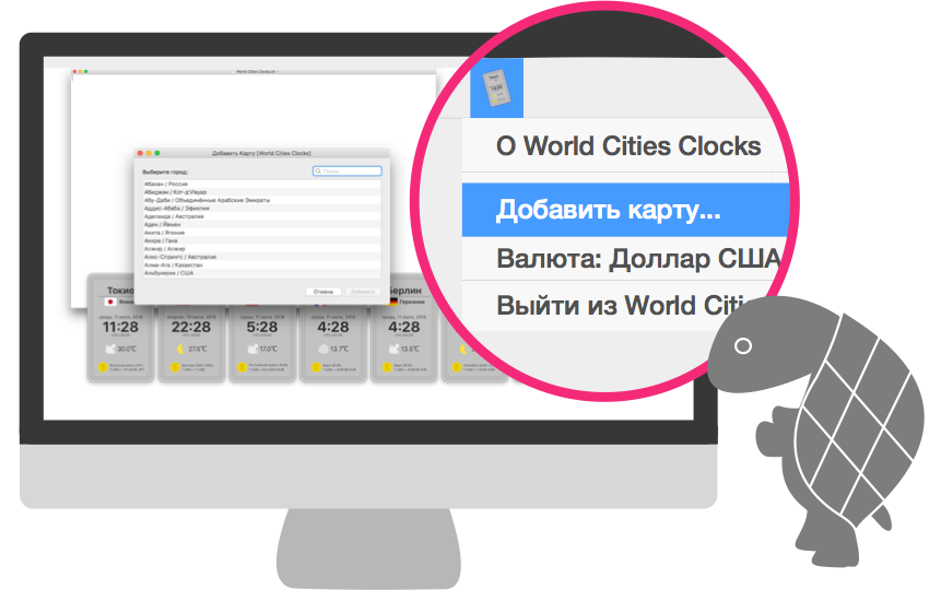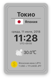 "World Cities Clocks" показывает время, погоду и курс валюты для каждого выбранного города в виде карточек.
